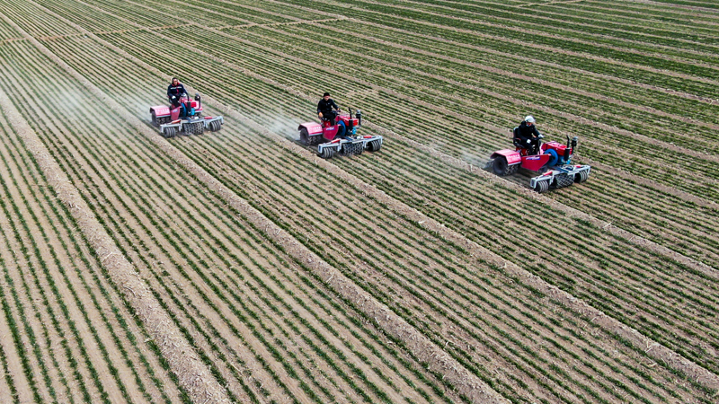 2月17日,在山东省聊城市莘县妹冢镇,农民在麦田里进行镇压保墒作业(无人机照片)。新华社记者 郭绪雷 摄