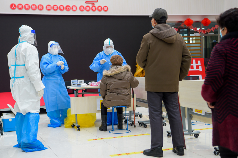 在内蒙古满洲里市东山街道办事处怡园社区府欣小区A区核酸采样点,工作人员为居民做核酸采样(2021年11月29日摄)。新华社记者 李志鹏 摄