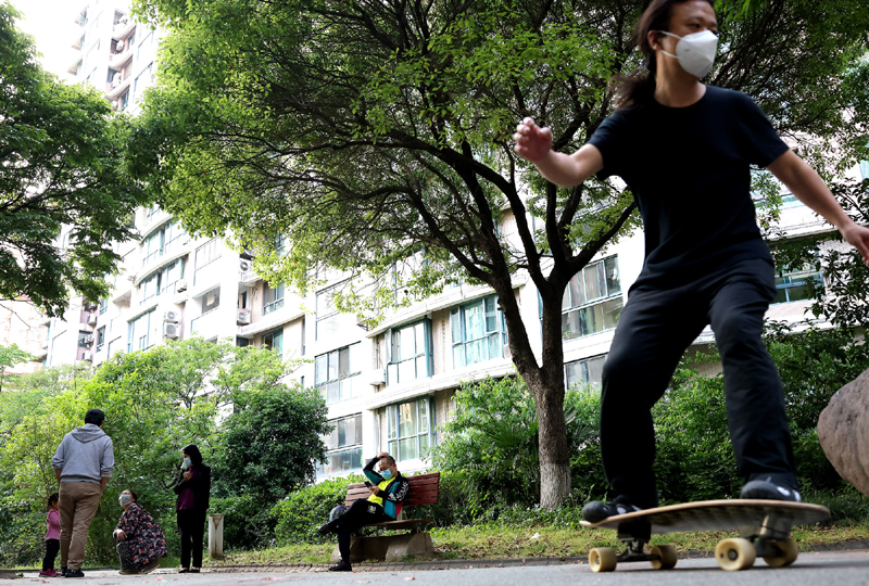 5月17日,市民在上海市普陀区的一个居民小区内享受休闲一刻。新华社记者 陈飞 摄