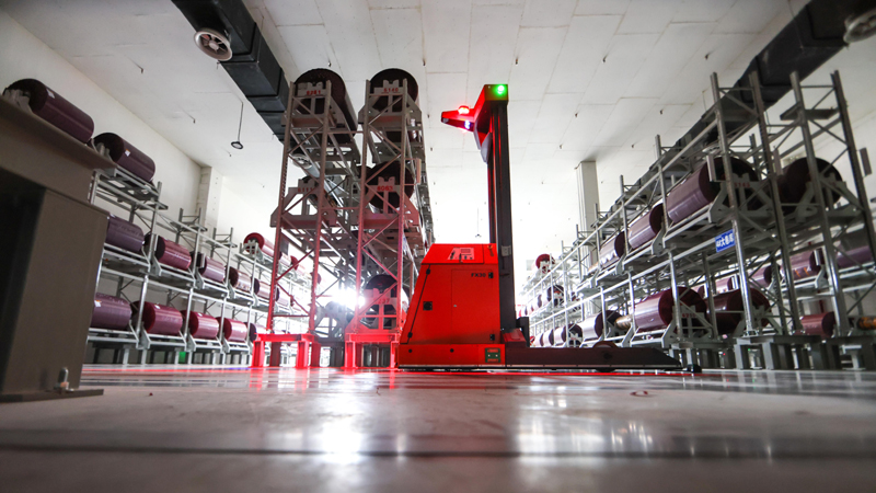 5月17日,AGV(自动导引运输车)穿行在贵州首个5G全连接工厂的部件生产区内。新华社记者 欧东衢 摄