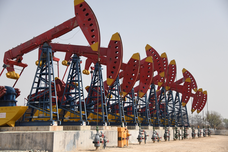 2021年3月31日,胜利油田孤岛采油厂的一排抽油机在作业。新华社记者 张武岳 摄